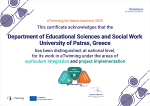 Το Τμήμα Επιστημών Εκπαίδευσης και Κοινωνικής Εργασίας (Τ.Επ.Ε.Κ.Ε.) του Πανεπιστημίου Πατρών τιμήθηκε για δεύτερη συνεχή χρονιά με την Εθνική Ετικέτα Ποιότητας eTwinning ITE (Initial Teacher Education) για Πανεπιστημιακά Ιδρύματα, για το ακαδημαϊκό έτος 2024–2025.